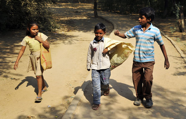 出生在印度新德里南部一個貧民窟的薩爾曼(中)和其他孩子去拾荒。新華社記者 王曄 攝