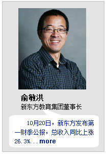 俞敏洪更是在金融危機(jī)沖擊下,使教育產(chǎn)業(yè)成為危機(jī)中的新亮點(diǎn)。其獲獎(jiǎng)理由是:“一個(gè)曾經(jīng)的留級生,讓無數(shù)學(xué)子的人生升級;他從未留過洋,卻組建了一支跨國的船隊(duì)。他用26個(gè)字母拉近了此岸和彼岸的距離。胸懷世界,志在東方”。