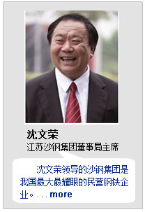 沈文榮領(lǐng)導(dǎo)的我國最大最耀眼的“草根”民企沙鋼集團(tuán)代表中國內(nèi)地唯一入選全球500強(qiáng),并在全行業(yè)虧損的背景下連續(xù)盈利,證明了其內(nèi)在的生命力。其獲獎(jiǎng)理由是:“在全行業(yè)集體低迷的背景下,他卻演繹著鄉(xiāng)鎮(zhèn)企業(yè)變身500強(qiáng)的傳奇。他有草根的韌性,鋼鐵的堅(jiān)強(qiáng)。他用34年的錘煉告訴人們,光榮是怎樣煉成的”。