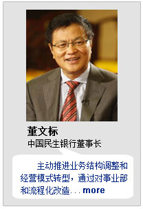 嚴(yán)峻的金融危機(jī)加速了經(jīng)濟(jì)結(jié)構(gòu)調(diào)整的進(jìn)程,各行業(yè)變革的力量推動(dòng)行業(yè)升級,激化出旺盛的生命力。董文標(biāo)再造民生銀行,超常規(guī)創(chuàng)新發(fā)展模式,實(shí)現(xiàn)對中小企業(yè)的大規(guī)模資金支持,作為產(chǎn)業(yè)的發(fā)動(dòng)機(jī)金融業(yè)開始從行業(yè)源頭發(fā)力。其獲獎(jiǎng)理由是:“走路飛快的小個(gè)子,領(lǐng)導(dǎo)著民字頭的企業(yè)航母。因?yàn)樯朴趶奈C(jī)中掘金,他實(shí)現(xiàn)了今年最大的IPO。助力四萬個(gè)中小企業(yè),他讓細(xì)流匯成江海。以民為本,生生不息”。