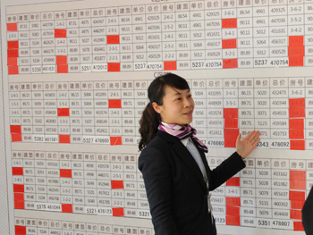 2009年貴陽市房地產(chǎn)開發(fā)累計(jì)完成近190億元,同比增長27.1%。2009年12月30日,貴陽一家房地產(chǎn)公司五天前推出的房子已售出1/3,售樓工作人員正在向看房者介紹情況(灰色表示已售)! ⌒氯A社記者 朱國賢/攝 |