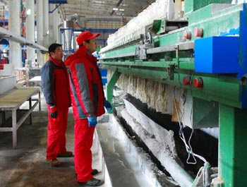 2009年12月26日,青海中信國安科技發(fā)展有限公司本年度第5000噸碳酸鋰下線。這標(biāo)志著青海省“鹽湖提鋰”已進(jìn)入工業(yè)化階段,國外碳酸鋰巨頭對中國市場的壟斷宣告結(jié)束。 圖為青海中信國安科技發(fā)展有限公司兩名工人在觀察設(shè)備運(yùn)轉(zhuǎn)。新華社記者 吳光于