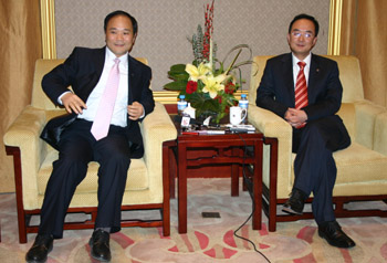 吉利汽車集團董事長李書福(左)與副總裁安聰慧接受本報記者專訪!∮浾摺侨A國/攝 |