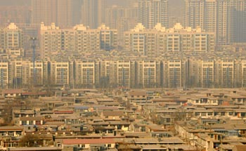 石家莊一個(gè)城中村與遠(yuǎn)處高樓相映襯,城中村由于租房?jī)r(jià)格低廉成為很多低收入家庭的聚居區(qū),而樓房則是他們中很多人遙不可及的夢(mèng)想。新華社記者 鞏志宏