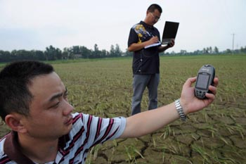2009年7月15日,安徽六安市國元農(nóng)業(yè)保險(xiǎn)公司的員工在舒城縣百神廟鎮(zhèn)開展查災(zāi)定損賠付工作,工作人員用GPS衛(wèi)星定位儀確定受災(zāi)田塊的經(jīng)緯度和面積。新華社發(fā)(陳力
