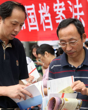 2007年9月5日,上海舉行紀(jì)念《中華人民共和國檔案法》頒布20周年檔案宣傳咨詢活動,此次活動面向公眾宣傳檔案法律知識,開展檔案便民活動。上海各級檔案館當(dāng)時(shí)已總計(jì)開放檔案180余萬卷,在史料展示、信息公開、便民服務(wù)等方面發(fā)揮了重要作用。新華社記者劉穎/攝 |