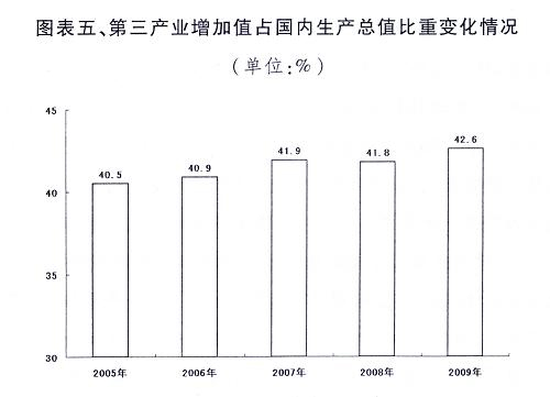 服務(wù)業(yè)穩(wěn)定發(fā)展。鼓勵(lì)服務(wù)業(yè)發(fā)展的政策措施得到進(jìn)一步落實(shí),財(cái)稅、供地、價(jià)格、金融等方面對(duì)現(xiàn)代服務(wù)業(yè)的支持力度加大,一批跨地區(qū)、跨行業(yè)、帶動(dòng)功能強(qiáng)、支撐作用大的服務(wù)業(yè)重大項(xiàng)目建設(shè)順利開(kāi)展。金融保險(xiǎn)、信息服務(wù)、物流配送、社區(qū)服務(wù)等發(fā)展迅猛,新興業(yè)態(tài)不斷涌現(xiàn)。第三產(chǎn)業(yè)增加值占國(guó)內(nèi)生產(chǎn)總值的比重達(dá)42.6%,比上年提高0.8個(gè)百分點(diǎn)。
