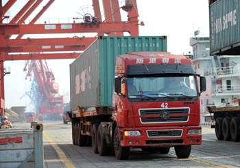 防城港物流卡車在裝運(yùn)集裝箱。新華社記者