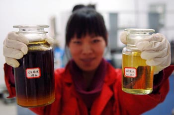 青海潔神環(huán)境能源產(chǎn)業(yè)有限公司工作人員在對(duì)比“地溝油”(左)和由餐廚垃圾處理而成的生物柴油。新華社記者 張宏祥