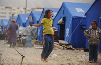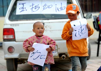4月17日,玉樹地震發(fā)生80個(gè)小時(shí)后,玉樹州孤兒學(xué)校60多名學(xué)生和十幾名老師齊唱國歌,在災(zāi)區(qū)率先復(fù)課。 下午3點(diǎn)半,師生們站在損毀的教室前,向地震中遇難的各族同胞默哀。他們身后,黨旗和救援隊(duì)的旗幟隨風(fēng)飄揚(yáng)。這所孤兒學(xué)校是一所九年級(jí)義務(wù)學(xué)校,在4月14日玉樹7.1級(jí)強(qiáng)震中,學(xué)校校舍損毀,但由于老師們?nèi)仍芾W(xué)生,各族同學(xué)相互幫助,全校160多名學(xué)生無一遇難。目前約100名學(xué)生已被親戚領(lǐng)回家中,其余60多名學(xué)生住在臨時(shí)搭建的帳篷內(nèi),在老師陪伴下度過了三天。 簡短的復(fù)課儀式后,同學(xué)們進(jìn)入板房教室開始上課。九年級(jí)學(xué)生邊措告訴記者,地震以來,每天經(jīng)歷的事情印象都很深,尤其是今天復(fù)課!翱吹绞迨鍌兘o我們搭帳篷、建板房,讓我們盡快開始學(xué)習(xí)知識(shí),心里特別感激,也特別激動(dòng)! 四所新搭建的板房教室已在原教室東側(cè)一處空曠地帶建成,每個(gè)教室可容納約40人。參與建設(shè)的鋁電公司員工王四東說:“這四個(gè)板房教室是今天早上開始搭建的,孩子們的學(xué)習(xí)不能耽誤,所以我們集中了40多個(gè)人,加快了搭建速度! 邊措說:“昨天,溫爺爺來看望我們,和我們合影。我相信溫爺爺?shù)脑挘荷罹拖裉栆粯映錆M希望。不管遇到多大的困難,太陽都會(huì)照常升起!