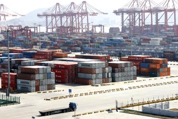 上海洋山深水港碼頭集裝箱堆場上的載貨集裝箱等待轉(zhuǎn)運。上海海關(guān)近日發(fā)布的上海外貿(mào)進出口數(shù)據(jù)顯示,2010年前4個月上海關(guān)區(qū)累計實現(xiàn)進出口總額2002.2億美元,同比增長38.1%。新華社記者