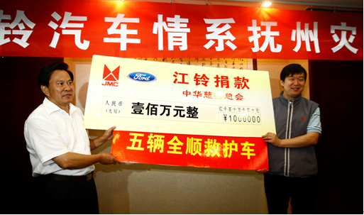 在江西等地發(fā)生的嚴重洪澇災害,造成了巨大的人員財產(chǎn)損失,牽動著國人的心。江鈴汽車股份有限公司全體員工心系災區(qū)人民,在第一時間作出反應,得到福特汽車公司和江鈴集團的支持,迅速組織賑災捐贈,在公司董事長王錫高指示下,公司緊急捐贈5輛災區(qū)急需的福特全順救護車并捐款100萬元人民幣,總計200萬元的款物給受災最嚴重的撫州洪澇災區(qū)。