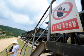 7月13日,紫金礦業(yè)銅礦濕法廠一處污水處理裝置掛著警示牌。 當(dāng)日,由于污水滲漏事故造成福建汀江流域污染的紫金礦業(yè)集團(tuán)股份有限公司向媒體通報(bào)了事件處理情況。紫金礦業(yè)集團(tuán)有限公司總裁羅映南接受記者采訪時(shí)說,“肇事”的銅礦濕法廠已經(jīng)無限期停產(chǎn),全面開展整改,同時(shí)將依照事故調(diào)查結(jié)論承擔(dān)事故責(zé)任和經(jīng)濟(jì)賠償。新華社記者