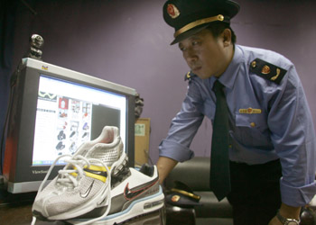 北京市工商人員查獲利用互聯(lián)網(wǎng)出售假冒耐克運(yùn)動用品的個體戶。 |