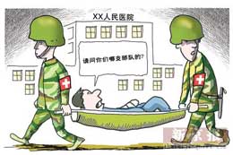 繼“深圳醫(yī)生戴頭盔上班”后,“醫(yī)生武裝自衛(wèi)”再上演。由于急診室護(hù)士和醫(yī)生接連遭遇病人威脅、恐嚇、打罵,因擔(dān)心人身安全沒有保障,江蘇鎮(zhèn)江第一人民醫(yī)院急診中心醫(yī)生護(hù)士申請戴頭盔佩警棍上班。(5月20日《揚(yáng)子晚報》)
