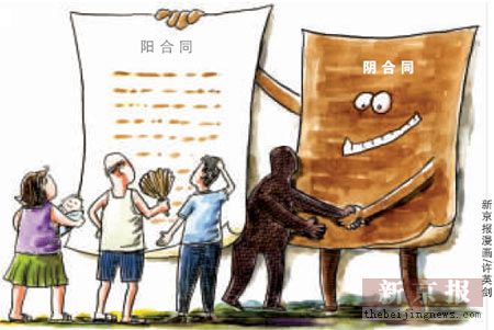 北京昌平舊村改造時承諾的村民新居沒見影兒,土地上卻建成了豪華別墅。在維權(quán)過程中,村民們追查出村委會、開發(fā)商簽訂的“陰陽合同”:公開給村民的“陽合同”中規(guī)定,舊縣村提供給開發(fā)商1820畝土地,收征地補(bǔ)償款6000萬;而交給政府有關(guān)部門備案的“陰合同”規(guī)定,開發(fā)商征用舊縣村土地689.41畝,補(bǔ)償金是1億余元。(《京華時報》8月26日)