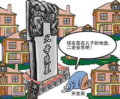 長沙一房地產(chǎn)開發(fā)商在自己開發(fā)的樓盤小區(qū)里,為父母建了一座豪華陵墓,據(jù)說修陵墓花了100多萬元。(新聞晨報3月19日報道) 先不說這位開發(fā)商的行為是否違反了殯葬管理條例禁止在鐵路公路主干道兩側、住宅區(qū)新建公墓的相關規(guī)定。就說這種在居民小區(qū)內私建“死人建筑”,其實也向物權法提出了挑戰(zhàn)。根據(jù)物權法規(guī)定,小區(qū)綠地、物業(yè)服務用房、公共場所等公共設施應歸業(yè)主所共有。 開發(fā)商雖然在獲得相關批準之后有權開發(fā)一塊土地,甚至有權對小區(qū)內格局進行規(guī)劃,但并非權利大到什么都能建的地步。而相對于比較弱勢一方的小區(qū)業(yè)主而言,在物權范疇里需要完善法律規(guī)定來維護自己的權利。 | |