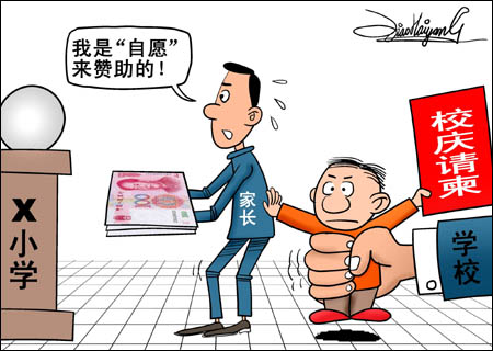 某小學(xué)借校慶之名給家長(zhǎng)發(fā)請(qǐng)柬,老師通過(guò)學(xué)生“轉(zhuǎn)話”:慶典之日到!百澲币幌,有的老師干脆給“份子錢(qián)”訂了200元的標(biāo)準(zhǔn)。校方解釋?zhuān)议L(zhǎng)贊不贊助完全出于自愿,學(xué)校并沒(méi)強(qiáng)迫。然而孩子在學(xué)校,家長(zhǎng)豈有不“自愿”之理!
