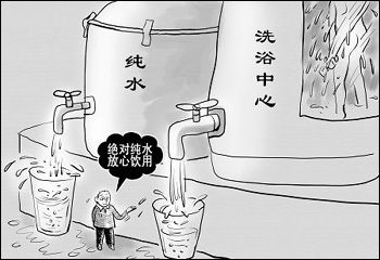 據(jù)《揚州日報》報道,當?shù)匾患蚁丛≈行幕ㄖ亟疬M口國外凈水設(shè)備,打出“可以喝的洗澡水”的廣告,經(jīng)理更是當著記者喝下了一杯凈化過的洗澡水,并稱他們的員工平時飲用的就是洗澡水。洗澡水縱然能喝,仍然是用來洗澡的。此種矯枉過正的經(jīng)商之道,實在叫人不敢恭維。