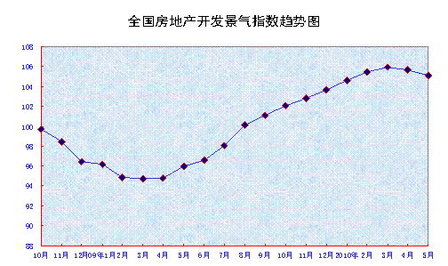 5月份,全國(guó)房地產(chǎn)開(kāi)發(fā)景氣指數(shù)(簡(jiǎn)稱(chēng)“國(guó)房景氣指數(shù)”)為105.07,比4月份回落0.59點(diǎn),比去年同期提高9.13點(diǎn)。
