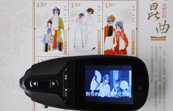 該套郵票是我國首套集音頻、視頻于一體的高科技多媒體郵票,兼具欣賞和收藏價值。郵票采用三層制版印刷技術(shù),票面上印有人物、建筑和多媒體視頻編碼,畫面極具層次感。用專用的視頻點(diǎn)讀筆點(diǎn)讀郵票內(nèi)容,可聽到清麗悠遠(yuǎn)的昆曲唱腔,并能觀看到美輪美奐的身段表演。