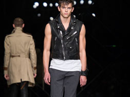 2011春夏男裝秀上的主打款式。不過,他為這種風(fēng)衣加入了更多新元素:搖滾感的鉚釘腰帶、拿破侖軍裝式的密集排扣、皮革拼接等等。另外,機(jī)車夾克也是設(shè)計(jì)師這一季的鐘愛,各種長度的修身款機(jī)車夾克搭配著鏤空、透明的針織品出現(xiàn),展現(xiàn)出Mod少年式的浮華不羈。Christopher