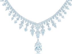 自1837年成立以來,蒂芙尼就以出品世界上最精美的鉆石著稱。這些無與倫比的精美鉆石在顏色、凈度和切割工藝上都遵照最高標準,鑲嵌在精致底座上散發(fā)流光溢彩,演繹著現(xiàn)代奢華。這件驚艷之作傳承了蒂芙尼一貫追求的卓越品質(zhì)傳統(tǒng)。鉑金鑲嵌手工切割的圓形和梨形鉆石圍繞著一枚30.31克拉、凈度為IF(內(nèi)部無雜質(zhì))級的鉆石吊墜。項鏈與女性優(yōu)雅的頸項曲線完美契合,星光熠熠,彰顯奢華氣質(zhì)。
