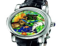 雅典(Ulysse Nardin)熱帶森林三問報時鉑金腕表這款獨具風格的腕表系列擁有直徑42毫米鉑金表殼,其所有魅力薈萃于具有三維立體效果的彩色琺瑯表盤:按下三問報時滑塊,報時聲響,一幅生動的熱帶森林景象立即顯現(xiàn)——猴子等動物在樹枝上飛奔跳躍,以躲避獅子的襲擊。表殼:鉑金材質(zhì),圓形表殼,鉑金底蓋。表盤:掐絲琺瑯,不設(shè)時間刻度,葉形指針,。機芯:手動上弦機械機芯,48小時動力儲備。功能:時、分、三問報時。
