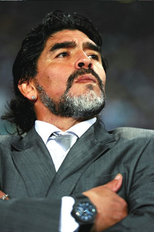 2008年11月4日,時(shí)年48歲的馬拉多納成為了阿根廷隊(duì)的主教練。在世界杯開(kāi)幕之前,他聽(tīng)從女兒的建議穿上了西裝,阿根廷《獨(dú)立報(bào)》這樣評(píng)價(jià)道,“這標(biāo)志著馬拉多納清楚地認(rèn)識(shí)到,自己不能在球場(chǎng)上親自施展奇跡了!泵摰羟蛞麓┥衔餮b,并且在左右手腕均戴上了Hublot腕表。馬拉多納從踢球的上帝變?yōu)榱艘幻麤Q策者,阿根廷隊(duì)的帶頭大哥。 在現(xiàn)在的這只阿根廷隊(duì)中,幾乎所有隊(duì)員都是看著馬拉多納踢球長(zhǎng)大的。因此,馬拉多納能夠?qū)⒆约禾咔驎r(shí)的反叛氣質(zhì)毫無(wú)保留地注入到這支隊(duì)伍中。很多人都認(rèn)為馬拉多納的這支阿根廷隊(duì)并不是完美無(wú)缺的,但是這并不妨礙隊(duì)員們一次次撕開(kāi)對(duì)手的防線,以最匪夷所思的方式將足球送進(jìn)對(duì)手的大門。整個(gè)過(guò)程輕松到他們的前鋒伊瓜因只需要在門前1米處將皮球輕巧地改變一個(gè)方向,便可以完成致命的最后一擊。 這是馬拉多納式的勝利,缺乏理性的邏輯,但卻痛快淋漓。實(shí)際上,在馬拉多納之后,人們總是喋喋不休地討論著誰(shuí)將成為他的接班人。而在本屆世界杯上,梅西終于讓所有質(zhì)疑的聲音消失。梅西在比賽中只有一種戰(zhàn)術(shù),這就是馬拉多納戰(zhàn)術(shù)。馬拉多納完全將梅西當(dāng)做1986年的自己,而尋找馬拉多納的接班人,這簡(jiǎn)直成了阿根廷隊(duì)必須完成的一種宗教儀式。