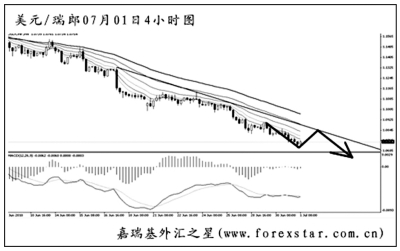 ▲美元兌瑞郎近期一直以下跌走勢(shì)為主,日線圖最近3周交易日只有2天收陽線,空頭動(dòng)能強(qiáng)勁。小時(shí)圖和4小時(shí)圖均出現(xiàn)了MACD底背離信號(hào),匯價(jià)有向上調(diào)整的欲望。關(guān)注下降趨勢(shì)線的阻力1.0830一線,預(yù)計(jì)美元兌瑞郎大幅升破趨勢(shì)線的希望不大。