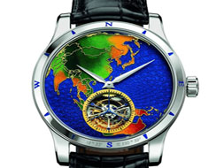 這款鉑金腕表的表盤采用內(nèi)填琺瑯,并以不同地理區(qū)域?yàn)橹黝},精心雕刻三款不同表款:亞洲和澳大利亞、美洲和歐洲,以及非洲和中東,其中陸地和海洋分別飾以日輝紋和波浪紋。每款限量生產(chǎn)20枚。表殼:鉑金材質(zhì),圓形表殼,表圈采用雕花刻度和基本方位,藍(lán)寶石水晶底蓋,可顯示機(jī)芯運(yùn)轉(zhuǎn)。表盤:以地理區(qū)域?yàn)橹黝}的內(nèi)填琺瑯彩繪微縮畫,阿爾法形指針機(jī)芯:自動(dòng)上弦機(jī)芯,配備陀飛輪,302枚零件,33枚寶石軸承,48小時(shí)動(dòng)力儲(chǔ)備,每小時(shí)振頻28,800次。功能:時(shí)、分、小秒針顯示。