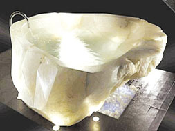 一個意大利生產(chǎn)的精美絕倫的水晶浴缸日前開出了79萬美元(約合人民幣535萬元)的高價!這個長2米、高55厘米的浴缸來自意大利,是用一塊巨大的白色水晶石雕刻而成的。這塊水晶石于2006年在巴西亞馬孫河流域被開采出來,外表看上去完美無瑕而且晶瑩剔透,經(jīng)萃取后原封不動地送往意大利。在那里,別具匠心的設(shè)計師把它打造成一個美輪美奐的浴缸,并精選鉆石配飾加以點(diǎn)綴。
