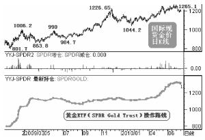Trust黃金持倉(cāng)變動(dòng)曲線(xiàn),中間的柱狀指標(biāo)代表其每次交易的增減倉(cāng)行為。從圖中可以看出,在2009年金價(jià)見(jiàn)頂1226.65美元后大幅調(diào)整至1044.2美元的過(guò)程中,SPDR
