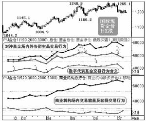 大型對(duì)沖基金黃金交易行為對(duì)保證金投資者而言最具參考價(jià)值。就投機(jī)獲利的交易目的而言,注定對(duì)沖基金的交易行為對(duì)保證金投資者而言最具參考價(jià)值,但難點(diǎn)是數(shù)據(jù)獲悉很難。 CFTC公布的交易數(shù)據(jù)很有局限性,但這已被大多分析機(jī)構(gòu)視為重要參考。在實(shí)際運(yùn)用中,如果只參考CFTC公布數(shù)據(jù),同樣容易產(chǎn)生認(rèn)識(shí)誤區(qū),甚至作繭自縛。故單純解讀并過(guò)于迷信CFTC的持倉(cāng)報(bào)告可能會(huì)自掘墳?zāi)。因(yàn)镃FTC公布的基金交易數(shù)據(jù)只代表其“一只手”的交易,另外還有看不見(jiàn)的場(chǎng)外交易黑手,而場(chǎng)外交易的黑手往往代表最真實(shí)的交易目的。圖3為某些大型對(duì)沖基金和部分商業(yè)機(jī)構(gòu)場(chǎng)內(nèi)外的交易行為線(xiàn)索及對(duì)應(yīng)金價(jià)運(yùn)行形態(tài)。為了使圖更為直觀,我們采取了加權(quán)平移坐標(biāo)的方式,故圖中右邊的坐標(biāo)數(shù)字只是相對(duì)坐標(biāo)。
