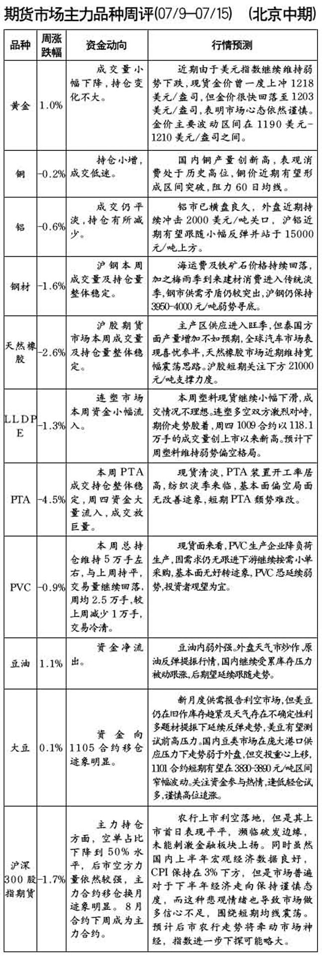 期貨市場主力品種周評[2010.07.09-2010.07.15]
