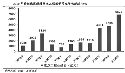 券商普遍認(rèn)為,西部大開發(fā)投資項(xiàng)目的出臺,“穩(wěn)增長”的意圖明顯,是“保增長”政策的延續(xù)。對股市有提振作用。 上海證券直接將西部大開發(fā)新增投資計(jì)劃稱為“縮小版經(jīng)濟(jì)刺激計(jì)劃”。 該券商發(fā)布的報(bào)告稱,當(dāng)前的6822億新增西部開發(fā)投資計(jì)劃,是應(yīng)對海外危機(jī)不確定性演變的“縮小版經(jīng)濟(jì)刺激政策”。國內(nèi)外經(jīng)濟(jì)形勢的不確定性,增加了市場對中國經(jīng)濟(jì)二次探底的擔(dān)憂。在當(dāng)前這種背景下,“新一輪經(jīng)濟(jì)刺激計(jì)劃”的出臺,將極大增強(qiáng)市場對中國經(jīng)濟(jì)增長持續(xù)性的信心。 國信證券表示,西部大開發(fā)投資項(xiàng)目出臺對市場影響正面。