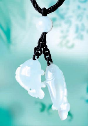 白色翡翠:雙魚造型,兩條魚并不相同,格外趣致。白色是樸素、雅致、貞潔的顏色。能中和任性、依賴、拘泥、悲觀、風(fēng)流多情、多愁善感、不切實(shí)際、感情脆弱等性格缺點(diǎn)。