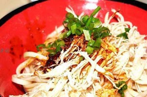 雞絲涼面是四川的傳統(tǒng)小吃,在四川全省都有很大影響。這種涼面可以選用機(jī)制的面條,入沸水中煮熟,煮時(shí)不能煮得太軟,撈出后放在案板上趁熱灑熟菜油少許,抖散讓它快速降溫,到互不粘連且已冷卻為止,才能稱之為涼面。雞絲涼面的特點(diǎn)是:多味調(diào)合,清爽利口,面條有筋力,為夏季佳品。
