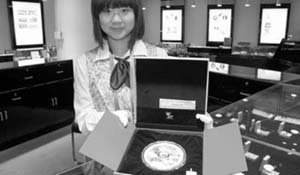 | 圖為老鳳祥銀樓員工向記者展示“世博金銀大同章” |