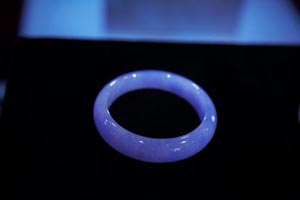 天然翡翠游龍如意紫玉璧:質(zhì)地細膩晶瑩,雕工精細,紫色濃艷純正,均勻遍布。翡翠紫如意象征事事順心,圓滿如意,紫氣東來。如意上生動地浮現(xiàn)著一尾螭龍,自古以來螭龍寓意美好、吉祥的事物,同時也象征男女之間融洽的感情。在濃正紫色的翡翠襯托下,螭龍顯得格外矚目,如此完美的結(jié)合是值得收藏的珍品。 天然翡翠紫氣東來萬福鐲:質(zhì)地細膩潤澤,無一絲綹裂,傳統(tǒng)的圓條款式洋溢著古典韻味,紫色濃艷純正,令原本傳統(tǒng)的設(shè)計帶有時尚感,其造型象征和諧圓滿,有傳承意涵。手鐲與如意以同一材料分割而成,兩者的結(jié)合實屬絕美搭配。