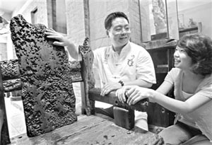張有峰(左)正對(duì)著一塊老船木與讀者探討設(shè)計(jì)方案