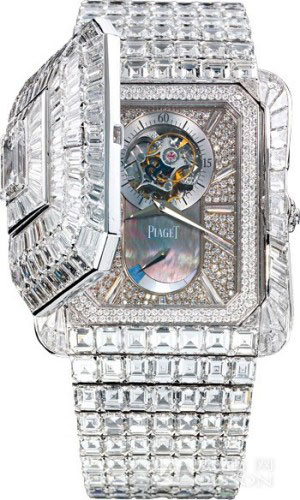 這枚白金腕表共鑲嵌1,144顆美鉆,表盤(pán)正中間為一顆重3 .35克拉祖母綠切割美鉆,奢華無(wú)比。輕觸第一枚鉆石按鈕,白色珍珠貝母表盤(pán)緩緩出現(xiàn)在眼前,設(shè)計(jì)簡(jiǎn)約,光澤獨(dú)特迷人,時(shí)間刻度由方形切割美鉆鑲嵌而成,配備伯爵56P石英機(jī)芯。而按下第二枚鉆石按鈕后,即能欣賞浮動(dòng)陀飛輪機(jī)芯的美妙運(yùn)作。得益于在超薄機(jī)芯領(lǐng)域的深厚功力,雙層腕表一直是伯爵的拿手好戲,一枚鑲滿鉆石的雙神秘開(kāi)關(guān)設(shè)計(jì)腕表不僅將伯爵善于結(jié)合頂級(jí)珠寶與制表工藝的特質(zhì)發(fā)揮得淋漓盡致,更讓這枚腕表成為一件獨(dú)一無(wú)二、美不勝收的藝術(shù)品,達(dá)到登峰造極的完美境界。
