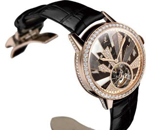 以多種極富女性魅力的元素裝飾陀飛輪腕表,是積家這款女裝陀飛輪腕表最吸引人眼球之處。這種流光溢彩的組合方式,不僅完美地將陀飛輪裝置與精湛的裝飾工藝融為一體,更展現(xiàn)出優(yōu)雅細膩的不凡氣度。腕表以18K玫瑰金制造表殼,直徑39毫米,更適合女性纖細的手腕。表盤設(shè)計靈感來源于裝飾藝術(shù)風(fēng)格,珍珠貝母、璀璨美鉆和美麗的羽毛拼鑲出簡潔大氣的幾何圖案,華美中不乏現(xiàn)代女性特立獨行的氣質(zhì)。腕表搭載積家978型自動上鏈機芯,動力儲存45小時。絹質(zhì)表帶,搭配鑲嵌鉆石的金屬折疊式表扣。此外,腕表亦有白金版,其中18K玫瑰金款鑲嵌315顆重約2.9克拉鉆石,白金款鑲嵌341顆重約3.2克拉鉆石。