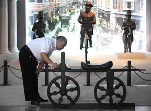 一位參觀者在端詳1790年由法國西夫拉克伯爵發(fā)明的“小馬仔”仿制品。據(jù)博物館工作人員介紹,這是世界上公認(rèn)的第一輛自行車。
