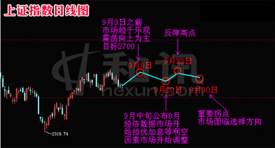 點(diǎn)。中國經(jīng)濟(jì)長期向好毋庸置疑,在此溫和通脹的宏觀背景下,股市中期仍然將會保持振蕩上漲格局,就9月份而言,銀行、地產(chǎn)、有色、鋼鐵、石化、航空航運(yùn)、煤炭采掘等行業(yè)總體處于較低估值水平,向下空間的相對有限,也封殺了大盤下跌空間。 因此總體上,9月將呈震蕩向上格局,月初9月9日拐點(diǎn)之前偏于樂觀,2700點(diǎn)仍可見到。而后,因?yàn)?月中旬8月宏觀經(jīng)濟(jì)數(shù)據(jù)出爐,通脹等因數(shù)將令市場重新?lián)鷳n央行加息提準(zhǔn)等利空因素,如果這種擔(dān)憂引發(fā)調(diào)整,那么調(diào)整或?qū)⒊掷m(xù)至9月20日時間窗口。隨后市場反彈至23日見高點(diǎn)后,調(diào)整至30日。因?yàn)槭婚L假即將來臨,周邊市場不確定加大,月底30日將是一個成交低迷期,市場面臨重新的方向性選擇。