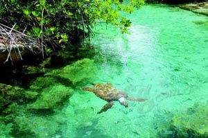 Mayakoba酒店,并以一場(chǎng)加勒比海畔的私人雞尾酒會(huì)為假期揭開了序幕。曾被《紐約客》及《紐約時(shí)報(bào)》冠以“海洋女皇”美譽(yù)的Sylvia在簡(jiǎn)單的開場(chǎng)白中為大家講述了她的故事:3歲時(shí),當(dāng)海浪拍打她的小腳,她就愛上了海洋。長(zhǎng)大成人后,她曾率領(lǐng)50次以上的探險(xiǎn),深入海中超過6000小時(shí)。而每當(dāng)她潛入深海時(shí),各種不可知事物的接踵而來,卻使她在危險(xiǎn)面前變得更加堅(jiān)強(qiáng)和泰然。這位海洋生態(tài)系統(tǒng)研究先驅(qū)者的勇氣與經(jīng)歷讓在場(chǎng)的每一位客人都為之動(dòng)容,也讓我對(duì)接下來的深海探索活動(dòng)滿懷期待。 第二天清晨,坐在酒店的輪渡上,戴著水中呼吸器的我已經(jīng)武裝完畢,略感緊張地與Sylvia博士一同融入了加勒比海的溫暖與奇幻中……滿眼的珊瑚礁群在蔚藍(lán)的世界里如寶石般晶瑩奪目,各種魚類悠然自得地舞動(dòng)穿梭,似乎絲毫沒有被我們的到來所驚擾。事實(shí)上,這片海域還擁有兩個(gè)世界最長(zhǎng)的水下洞穴系統(tǒng)—Sac