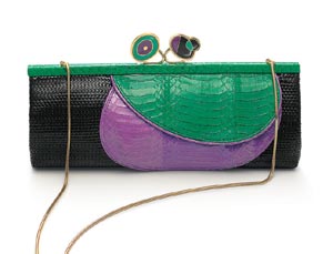 看出包扣是什么了嗎?沒(méi)錯(cuò),眼睛,還是眼睛!這正是Party系列的點(diǎn)睛之筆。出席晚宴或派對(duì),只需以這樣一款出色的晚宴包來(lái)搭配簡(jiǎn)約禮服,便能瞬時(shí)謀殺菲林無(wú)數(shù)。三款魅力十足的晚宴包,無(wú)不乖張靈動(dòng),華麗的蛇皮鑲邊,金色、黑色、粉色、紫色等的心機(jī)搭配,挑戰(zhàn)著你的視覺(jué)品味。想要在Party上來(lái)點(diǎn)不一樣的感覺(jué),就信心滿滿地帶著它去盡情炫耀吧!