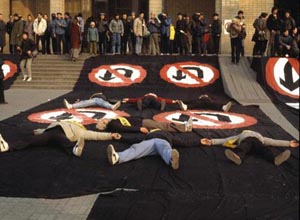 | 1989年2月,第一個中國現(xiàn)代藝術大展,藝術家們在不準調頭的標識上展示創(chuàng)意。 | 我們的工作室越來越大了,我們的展覽越來越多了,我們的飯局越來越豪華了……我們的思念越來越淺了,遺忘能力越來越強了,孤獨越來越深了,記憶越來越短了,我們的過去越來越遠了——