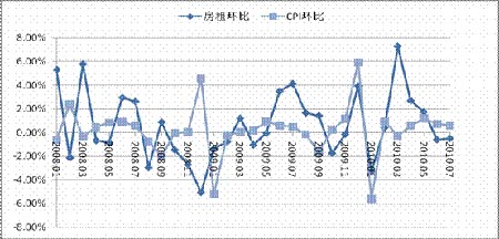2008年-2010年北京租賃市場租金價格同CPI環(huán)比漲幅趨勢對比