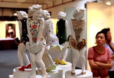 第十四屆上海藝術(shù)博覽會(huì)日前舉行開(kāi)幕預(yù)展。此次藝博會(huì)的主題是“讓收藏成為風(fēng)尚”,匯聚了來(lái)自中國(guó)、德國(guó)、法國(guó)等14個(gè)國(guó)家的126家畫(huà)廊前來(lái)參展。在展出的作品中,不僅有羅丹、畢加索、達(dá)利、莫奈等世界藝術(shù)大師的原作,還有張大千、齊白石等收藏家夢(mèng)寐以求的中國(guó)大師的精彩畫(huà)卷,當(dāng)代藝術(shù)的名家陳逸飛、羅中立、陳丹青等的佳作也紛紛登場(chǎng)。全場(chǎng)約有6000余件油畫(huà)、國(guó)畫(huà)、版畫(huà)、雕塑、水彩、攝影、裝置、陶瓷等作品供藝術(shù)品收藏者選購(gòu)。圖為觀眾在欣賞陶瓷雕塑作品《夢(mèng)露的中國(guó)夢(mèng)》。